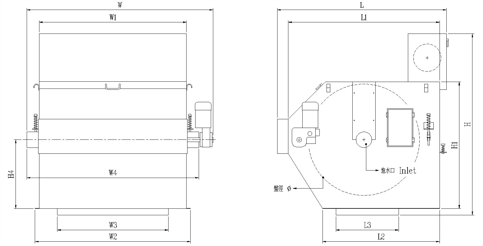 | Model | L/Min* | L | W | H | L1 | W1 | H1 | L2 | W2 | L3 | W3 | W4 | H4 | Inlet | (ψ) | (mm) | (HP) | The machine models which are suitable to install this magnet filter | |||||